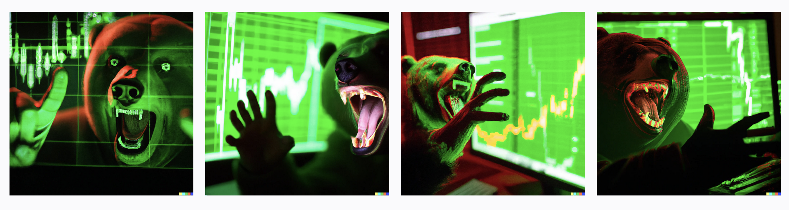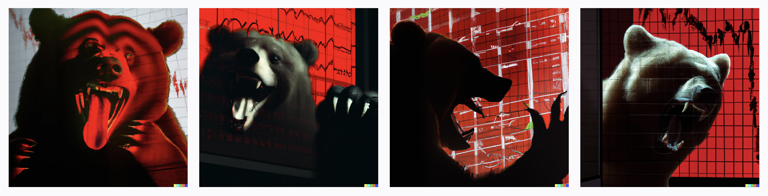 During the process of learning how to talk to it, I shared some images with one of my favorite business-oriented internet forums. The query for the second row of images was“evil bear laughing maniacally from the shadows as he hides behind a transparent computer screen displaying stocks with downwards trends in red”