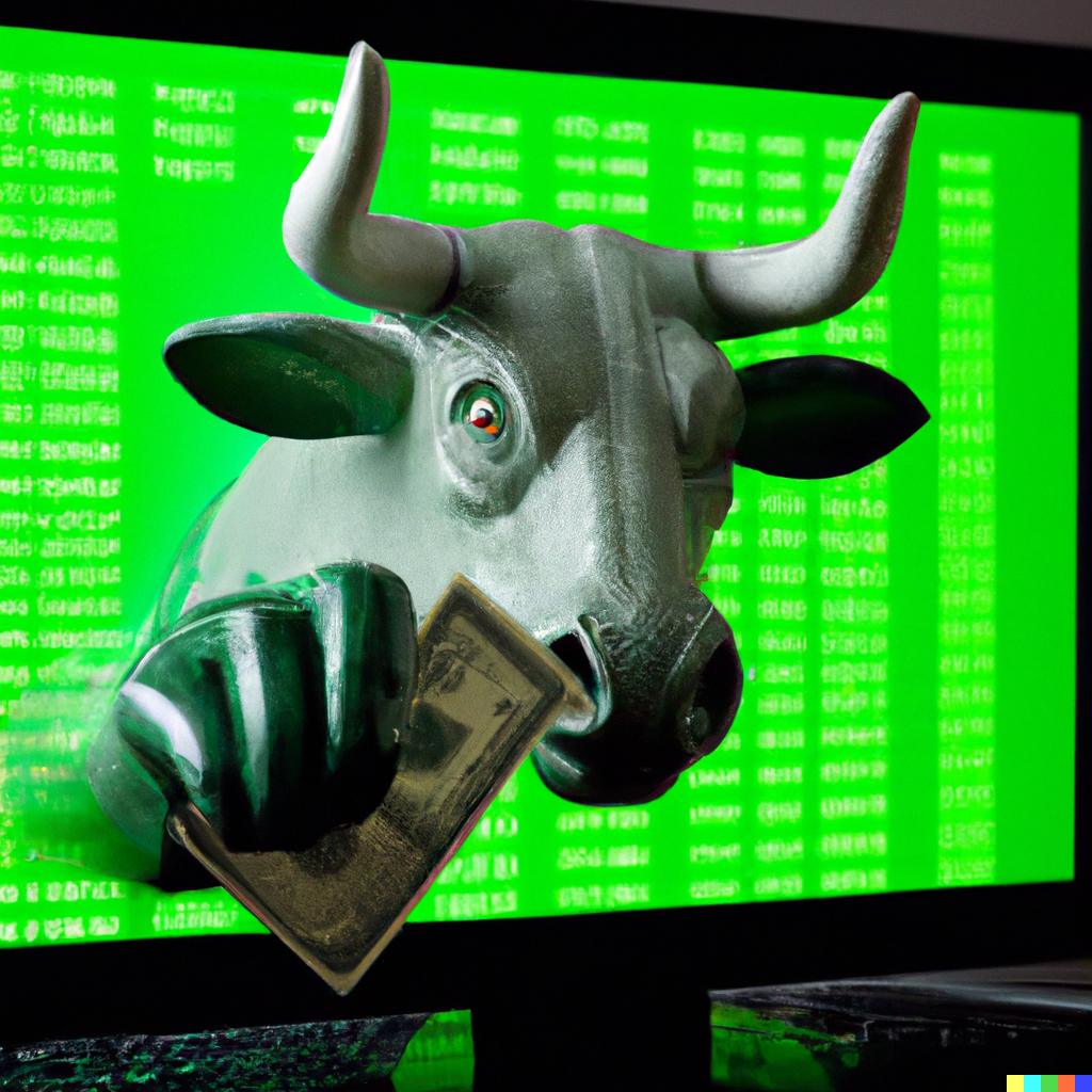 “Benevolent and charitable bull handing you dollar bills from through a transparent computer screen displaying stocks with upwards trends in green”