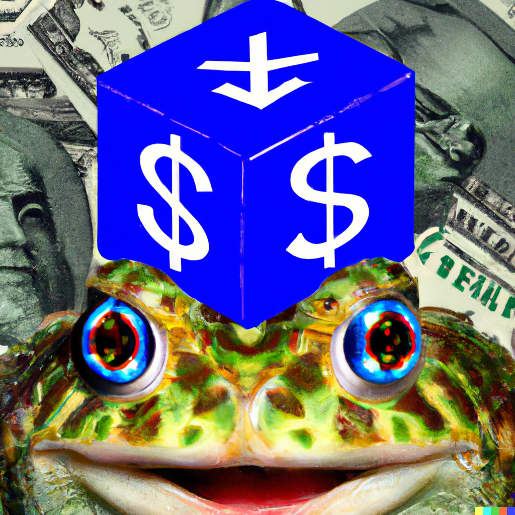 “A toad with a euphoric facial expression and dollar signs over his eyes behind a bright glowing blue arrow blasting upwards accompanied by 3 white cubes, painted by rembrandt”