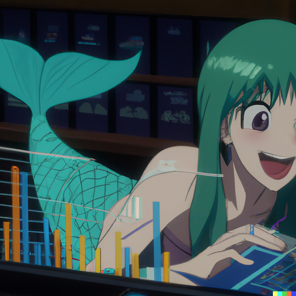 Instead of generic laughing mermaids, I got something really cool back. Now it does look "AI-ish", but so does everything examined up close from OpenAI DALL·E. The query used reads; “Screenshot of the mermaid laughing at sales charts on a computer screen from the movie Mermaid Stock Trader by Hayao Miyazaki”. OpenAI DALL·E can be nudged to draw more complex or rich imagery, by describing something as if it was a photo or screenshot that really exists. Presumably, that's how it was trained!