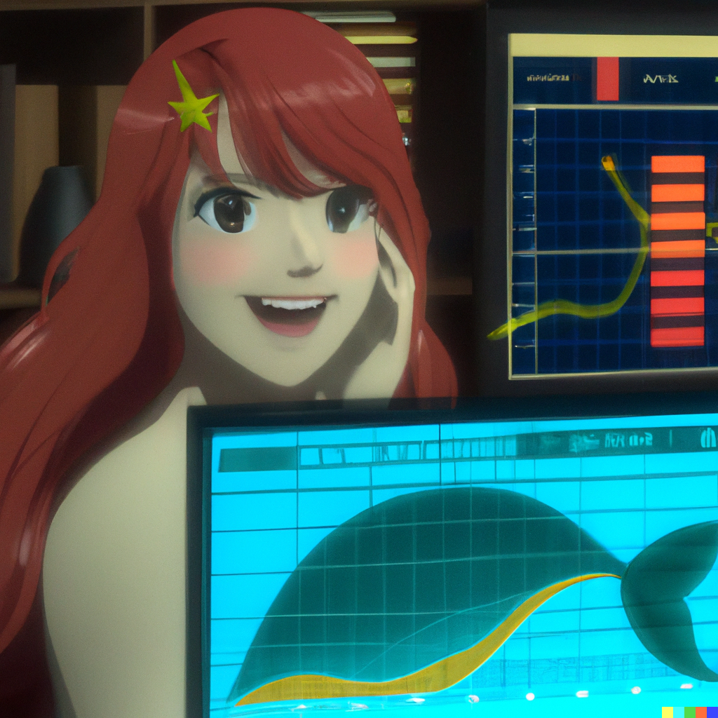 “Screenshot of an anime mermaid laughing at sales charts on a computer screen from the movie Mermaid Stock Trader by Hayao Miyazaki”