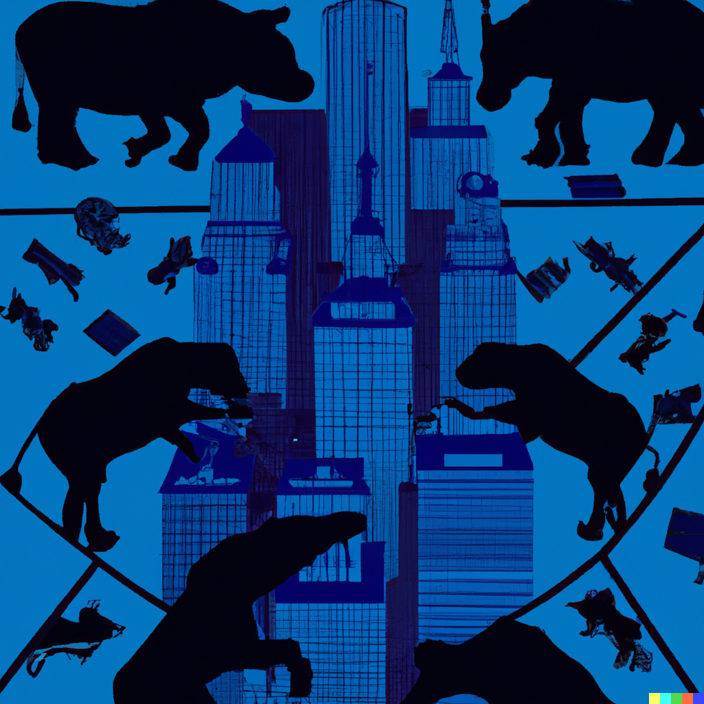 “Cross section of new york, upper part is wall street, lower part bulls and bears in masks stealing bags of money, night sky blue tint”